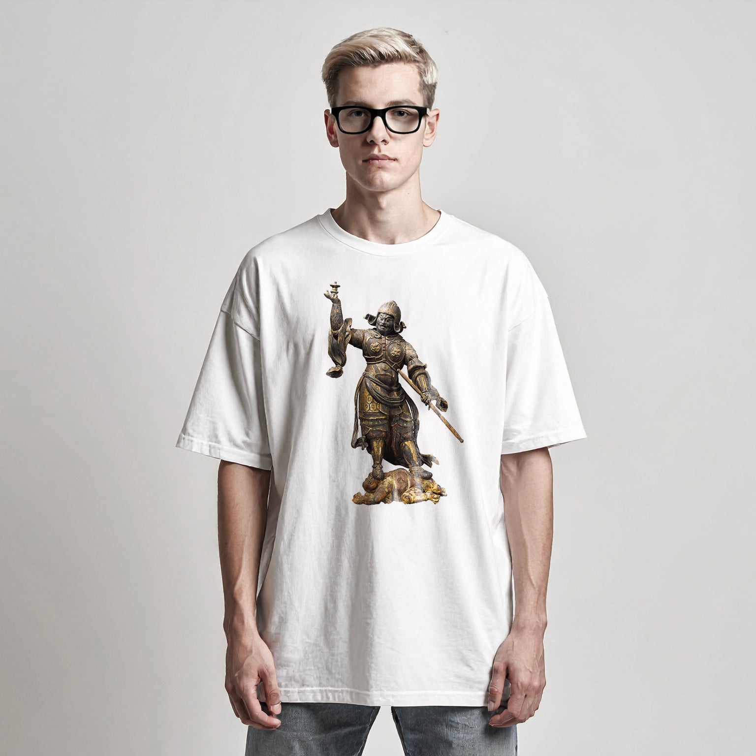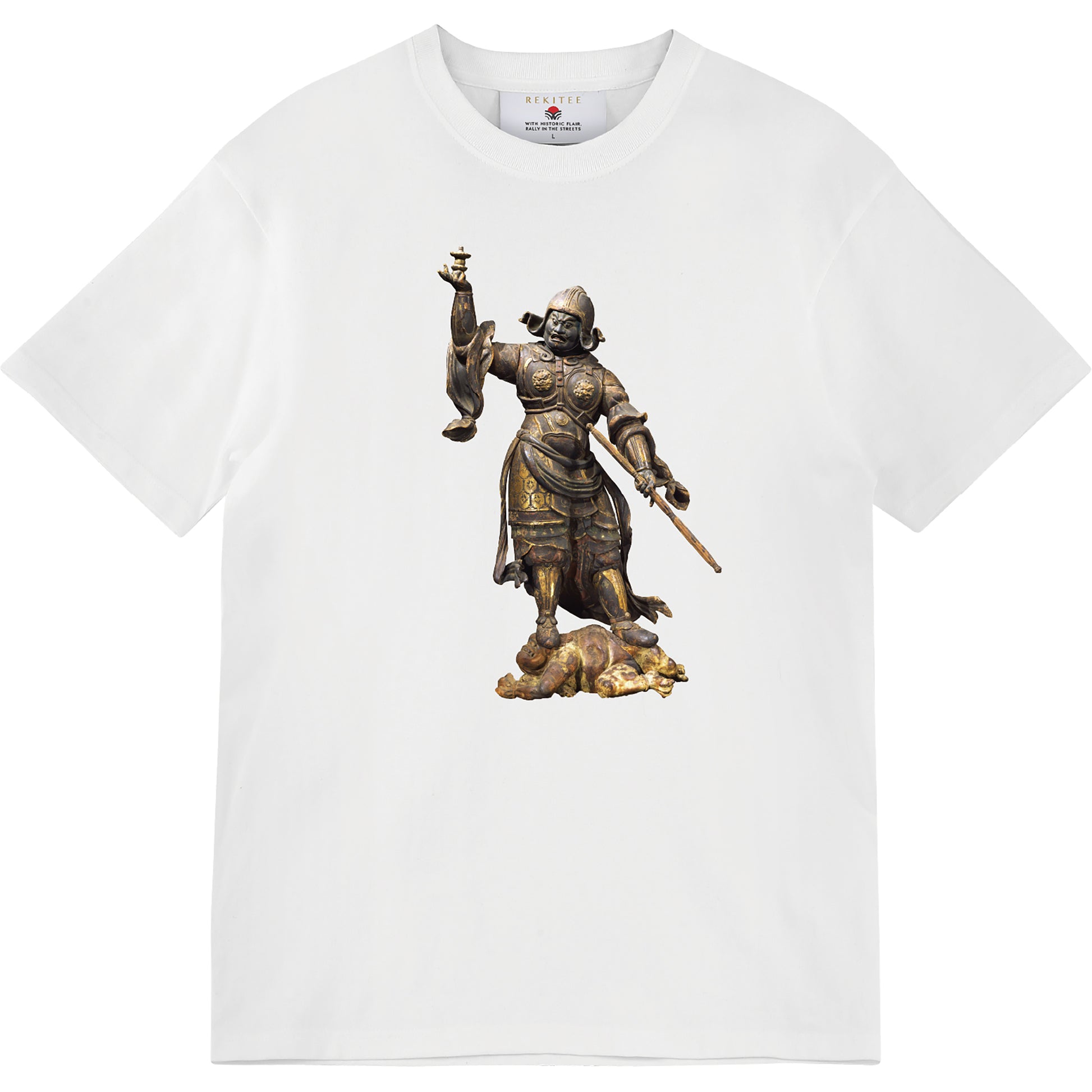 Tamonten, originally a deity from ancient India, later became one of the guardian deities of Buddhism. In Japan, he is known as one of the Four Heavenly Kings and is also venerated as a god of war under the name "Bishamonten." This statue presents a dynamic figure dressed in armor reminiscent of Tang Dynasty generals, holding a pagoda in his right hand and a staff to subdue evil in his left, while trampling a demon underfoot.
