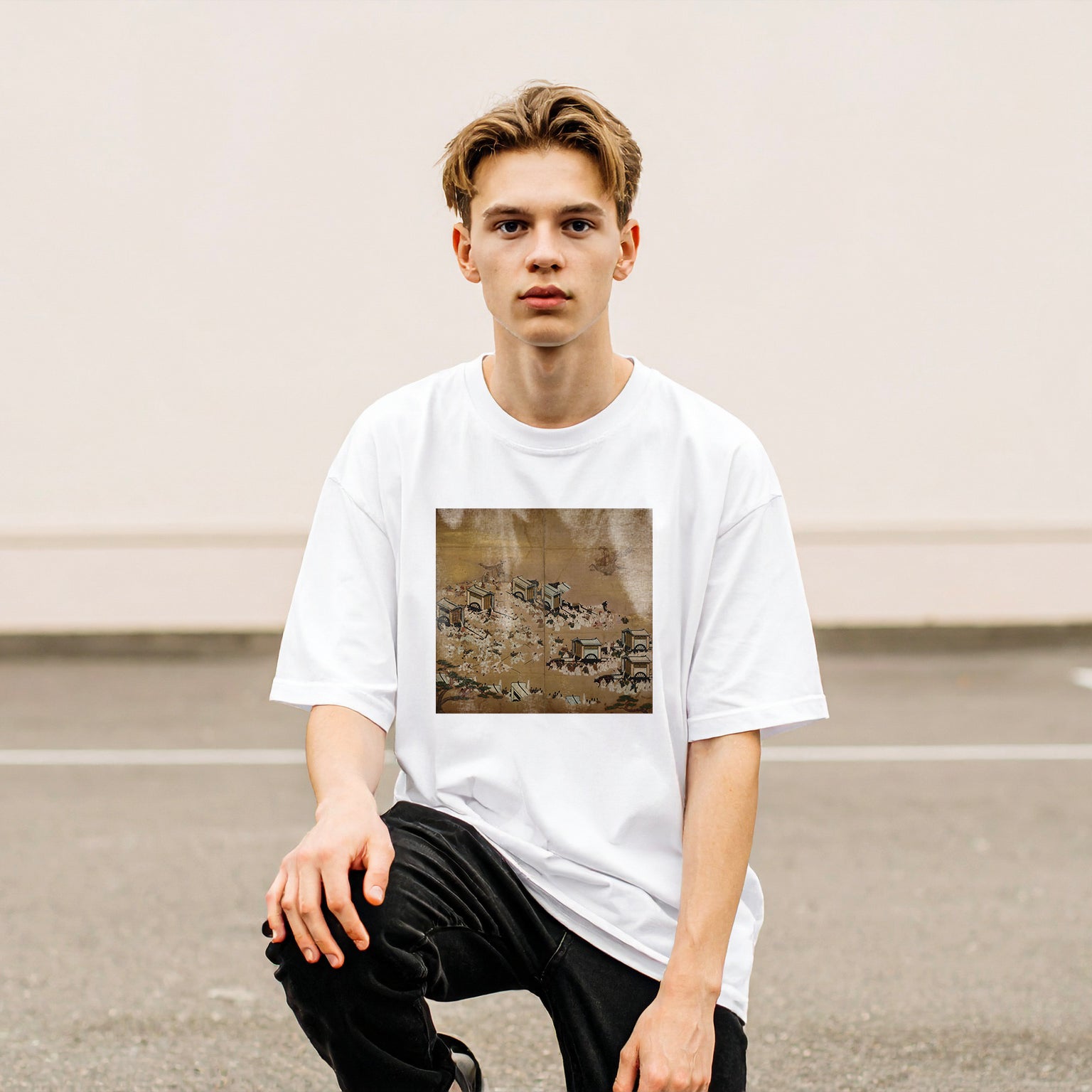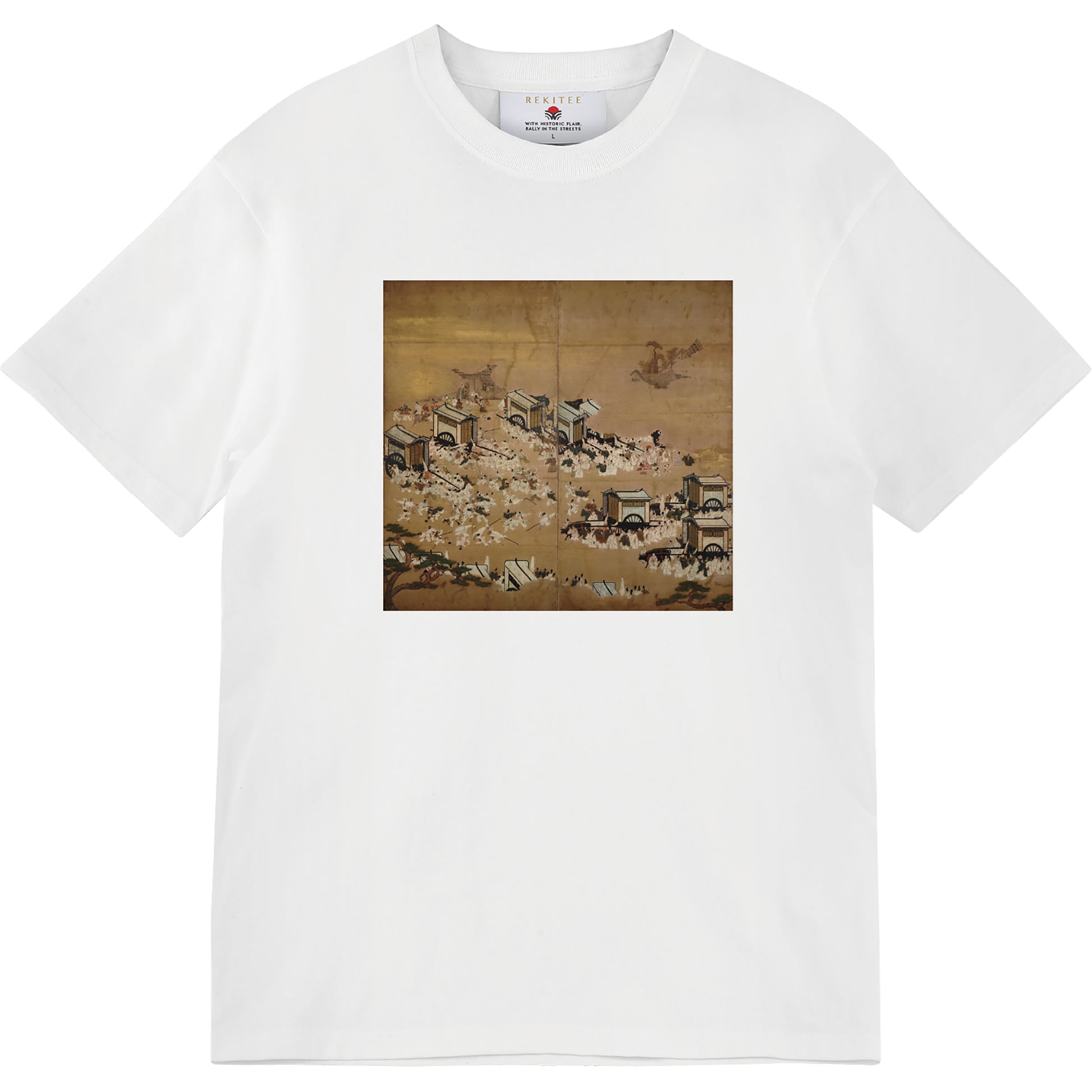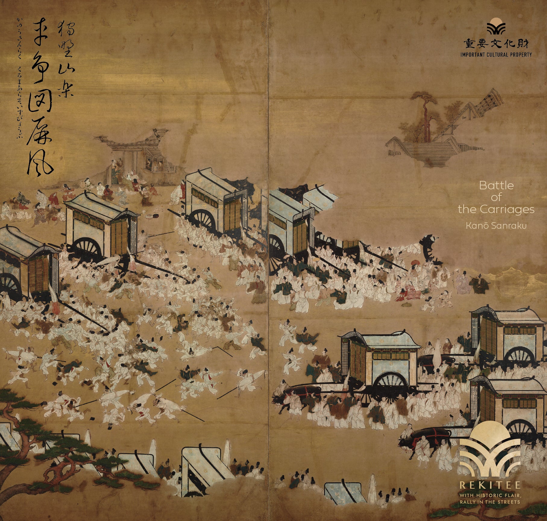 This work depicts a scene from "The Tale of Genji," portraying the dispute between Lady Aoi and Lady Rokujō over the positioning of their ox-drawn carriages during a festival procession. The chaotic struggle is vividly illustrated using a circular, bird's-eye-view composition. Hikaru Genji, riding a splendid black horse, stands out prominently among the figures.