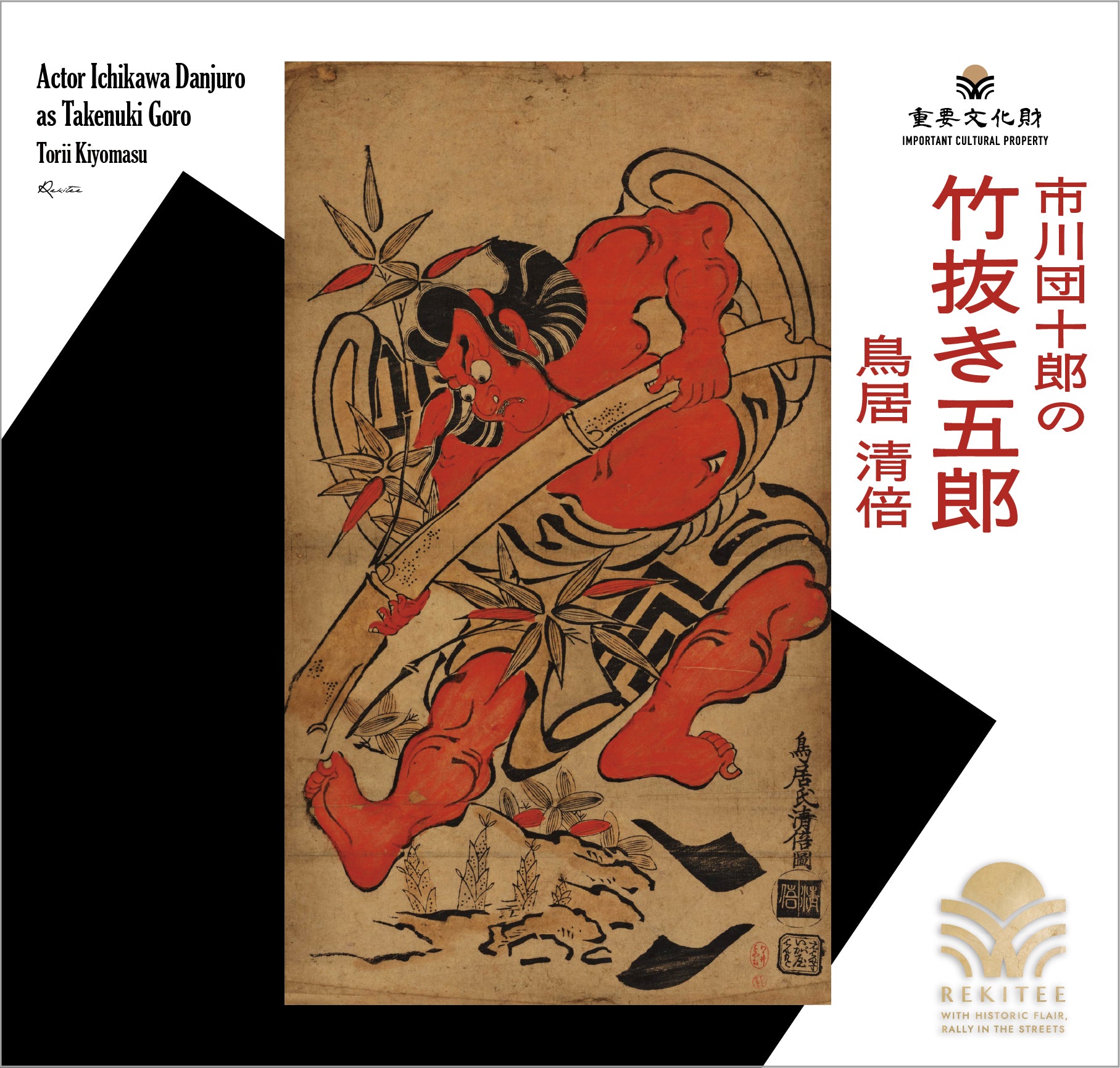 This ukiyo-e depicts Ichikawa Danjuro I performing kabuki in 1697. The portrayal is highly stylized to emphasize the character's dramatic presence, employing techniques such as exaggerated musculature in the limbs, legs tapered into gourd-like shapes, and bold, dynamic brushstrokes that convey a sense of movement.